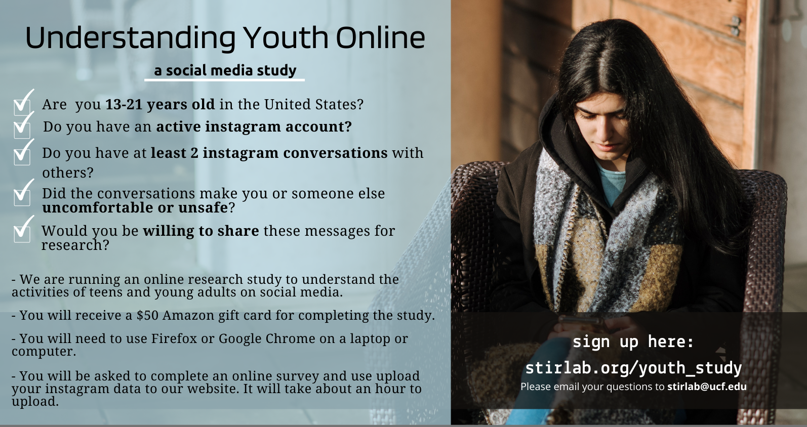 MOSafely: Building An Open-Source HCAI Community To Make The Internet A Safer Place For Youth STIR Lab students Xavier Caddle and Afsaneh Razi are leading the MOSafely Workshop at CSCW, in collaboration with students from Georgia Tech and Boston University. The goal of this one-day workshop is to begin building an active community of researchers, […]